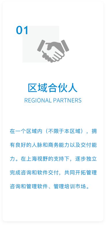 成立二十年来,上海视野励精图治,稳步发展,逐渐在国内管理控制咨询和数字化转型领域积累了颇具规模且稳定的客户群体,在行业内逐步产生了一定的影响力。为将上海视野发展到一个新高度,满足上海视野扩张需要,继续扩大视野品牌影响力,我们将向全社会寻找认同公司发展战略和企业文化,并且意愿与上海视野共同成长的合作伙伴。